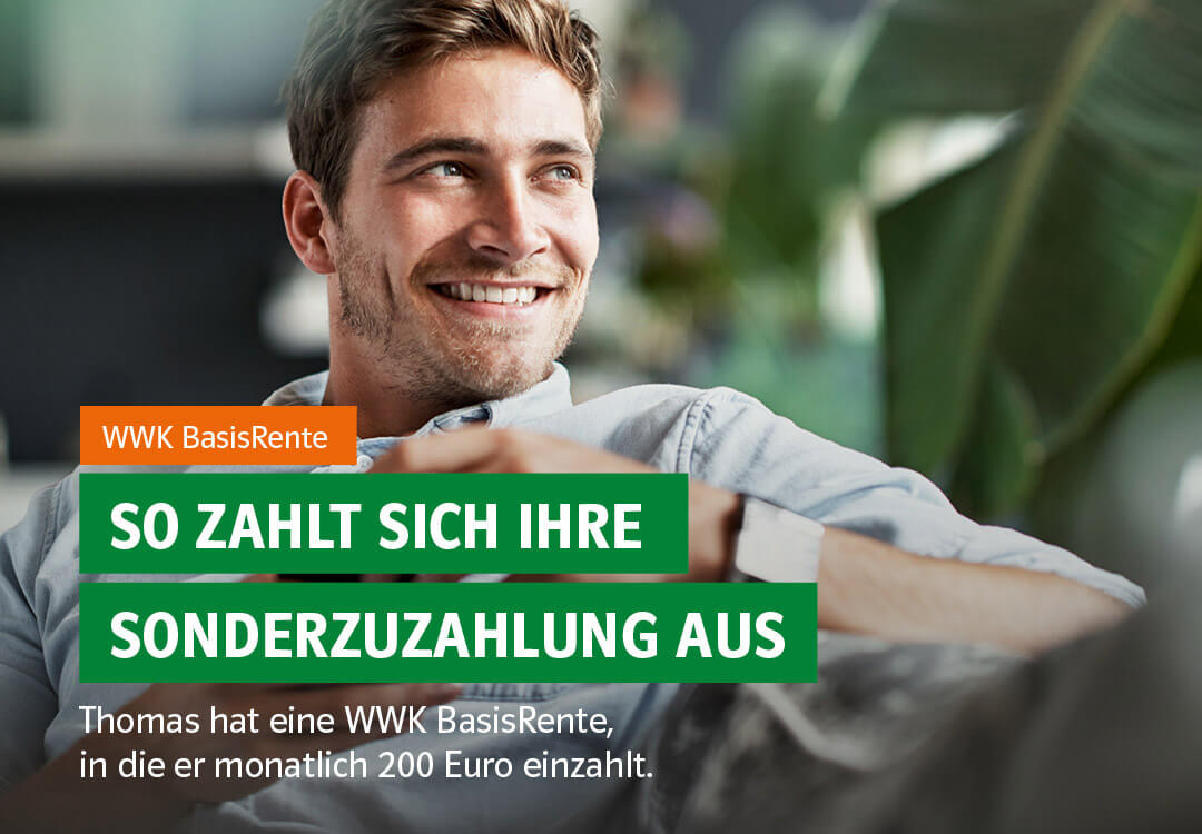 Mit der WWK BasisRente haben Sie sich für die clevere Art der Absicherung Ihres Ruhestands entschieden. Neben dem stattlichen finanziellen Polster für später bietet Ihnen die WWK BasisRente eine attraktive Möglichkeit, bereits heute satte Steuervorteile* dank Sonderzuzahlungen auszuschöpfen.